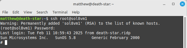 If you get errors about xterm-256color: Unknown terminal type, SSH with TERM=xterm ssh user@host. Of course you may find it a good idea to disable root login. All configuration changes are made in /opt/csw/etc/ssh/sshd_config and require restarting the service with /etc/init.d/cswopenssh restart. I didn’t bother with this, as this is 15-year-old software running on a 25-year-old OS.