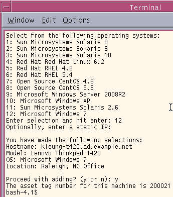 While bash, gzip, less, and unzip aren’t needed for this particular exercise, they are nice to have. I unzipped each file and mounted the NFS share on the Solaris 2.6 host (it needs to be an NFSv3 share): mount IP:/share /mnt. cd to /mnt/sunfreeware and change to the C shell with csh. Then execute the below, hitting enter on each line and entering y if prompted: