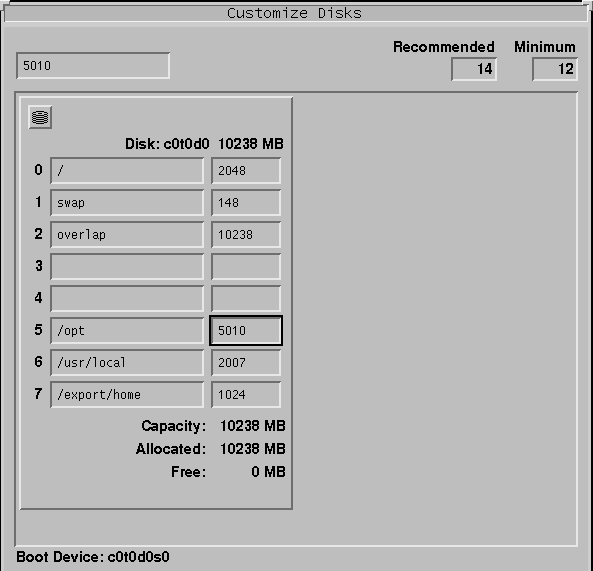 I allocated 5 GB to /opt, as this will be the partition that the Oracle 8i software will be installed on, while allocating 2 GB to /usr/local, which will contain the Sun Freeware utilities I will need to add.