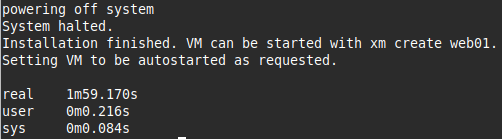 The below screenshot shows me starting the installation of the VM web01 on my Xen host. The installation is quick, taking under two minutes to complete, as the second screenshot shows (a few times it took over three minutes). And mind you: this is running on an 18-year-old laptop with a spinning hard drive, not a modern PC with an NVMe drive and 32GB of RAM.