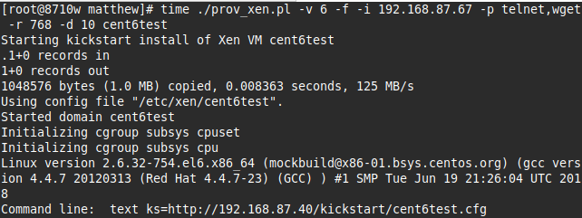 For this exercise, I followed the simple guide on the archived CentOS wiki, found here. The guide provides all of the steps for doing a kickstart installation (Red Hat automated installation) of a CentOS 5 Xen domU instance. The only thing I would have added to the guide would have been the step of generating a MAC address for the instance, as Xen generates a new MAC address each time a host is booted.
