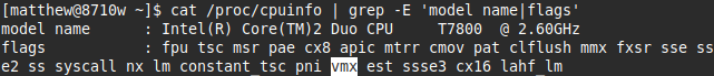 The host machine on which I am running CentOS 5 and Xen is era-appropriate: an HP Compaq 8710w laptop from 2007, the same year that CentOS 5 was released. It has a 2.6GHz Core2 Duo CPU and the maximum 4GB RAM, along with a regular old spinning hard drive—cutting edge stuff in 2025! Notably, it does support hardware virtualization: