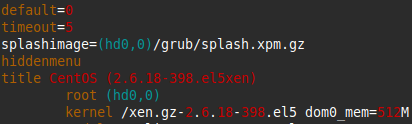 default=0 timeout=2 splashimage=(hd0,1)/boot/grub/splash.xpm.gz hiddenmenu title CentOS (4.9.241-37.el6.x86_64) root (hd0,1) kernel /boot/xen.gz dom0_mem=512M,max:512M loglvl=all guest_loglvl=all module /boot/vmlinuz-4.9.241-37.el6.x86_64 ro root=UUID=disk-uuid rd_NO_LUKS rd_NO_LVM LANG=en_US.UTF-8 rd_NO_MD SYSFONT=latarcyrheb-sun16 crashkernel=auto KEYBOARDTYPE=pc KEYTABLE=us rd_NO_DM rhgb quiet module /boot/initramfs-4.9.241-37.el6.x86_64.img