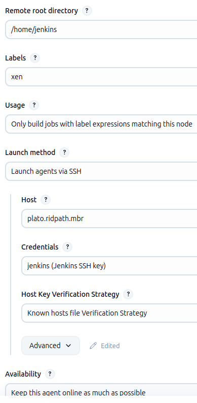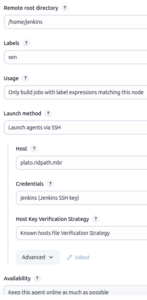 To launch a node, go to Manage Jenkins > Nodes > New Node. Enter a name for your node, select Permanent Agent, and click the Create button. On the next screen, fill out the required options. Below is what I entered. Note: if you select “Known hosts file Verification Strategy” for “Host Key Verification Strategy,” you will have to do the following if your Jenkins controller is running under Docker: