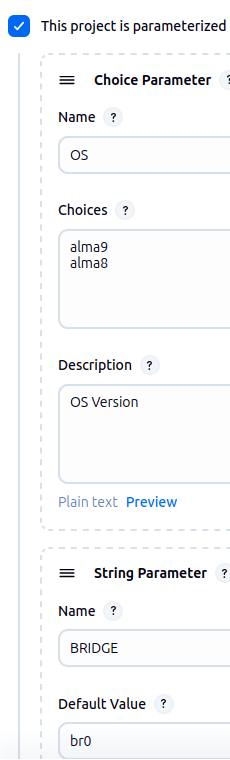 • I checked “This project is parameterized.” I created a choice parameter, OS, with the options of alma9 and alma8. I also created a string parameter, BRIDGE, with the default value of br0.