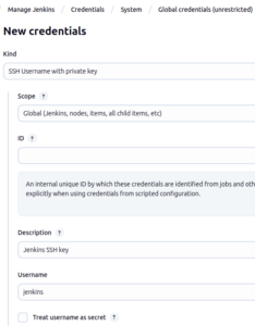 I thought it might be interesting to turn the above into a Jenkins job. Full disclosure: I am not a Jenkins expert. I know how to install it and create simple jobs, but there is a high chance that whatever I am doing is wrong. One thing this post will not dive into is installing the Jenkins controller. My controller is running in Docker with the jenkins:lts-jdk17 image, which will be end of life this year, but is still being updated as of this writing. Back in 2021, I wrote a post on setting up a Jenkins build node using Ansible. The post is somewhat dated at this point (it references CentOS 8 for example), but the steps will be similar to what I did here. First, I generated an SSH key with a passphrase: ssh-keygen -t ed25519 -C Jenkins -f jenkins. I then added that key as a global credential in Jenkins under Manage Jenkins > Credentials > System > Global credentials: