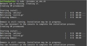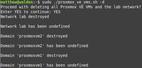 My original goal with this exercise was to automate the creation of these VMs with Terraform; however, the Terraform provider for libvirt does not perform ISO installations. My goal was to be able to spin this environment up when needed, and delete it when I no longer need it. I ended up accomplishing this with a Bash script. When executed without any options, the script, proxmox_ve_vms.sh, will create the lab network and provision the virtual machines. When executed with the –d option, the script will delete the network and the VMs.