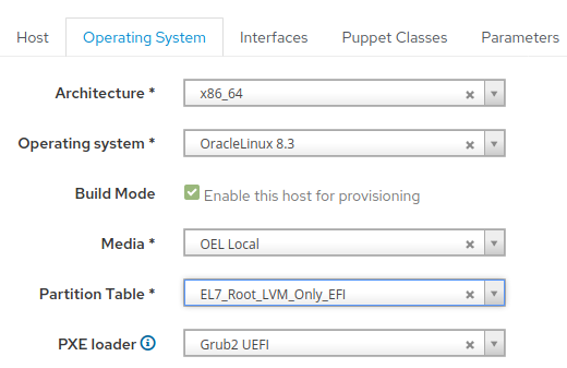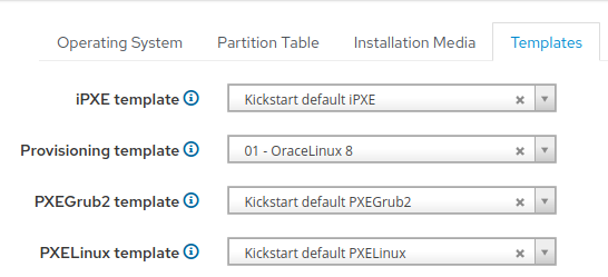 Before creating your host, you will need to have the following template types associated with your host’s operating system version: Provisioning (your Kickstart file), PXELinux, iPXE, and PXEGrub2. This has always been annoying to do in Foreman, because you have to first make the template available to the OS under Provisioning Templates > template > Associate, then enable it at Operating Systems > OS > Templates.